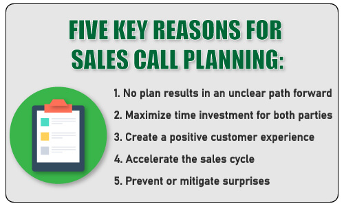 Sales reps must always keep in mind that the customer being called on typically has limited time and budget, and a plethora of other options to choose from. Effective call planning relates to all sales interactions, at all stages of the customer lifecycle. Investing time in call planning is a best practice for any salesperson who is looking for better control of their sales process and customer relationships, not just a struggling sales rep. When a call is made with clear direction and purpose, it provides the salesperson with more confidence and the customer with a better experience, which will lead to greater success.