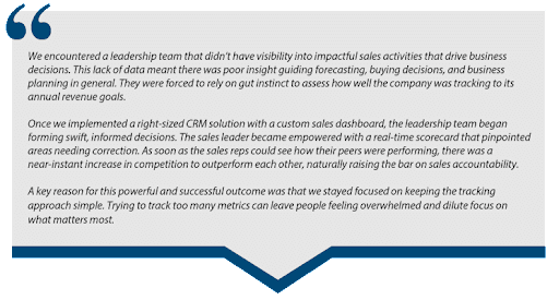 - Difficult Tracking- Make it a priority at launch that the dashboard will be updated on a regular basis, ideally real-time through use of a Customer Relationship Management (CRM) system. Don’t create metrics that cannot be easily tracked such as gross margin. When you have a multitude of products where costs tend to vary on a daily basis, your gross margin is a constantly moving target. Metrics need to be readily accessible to the salesperson and sales leader in order to serve as a real-time, automated guide.