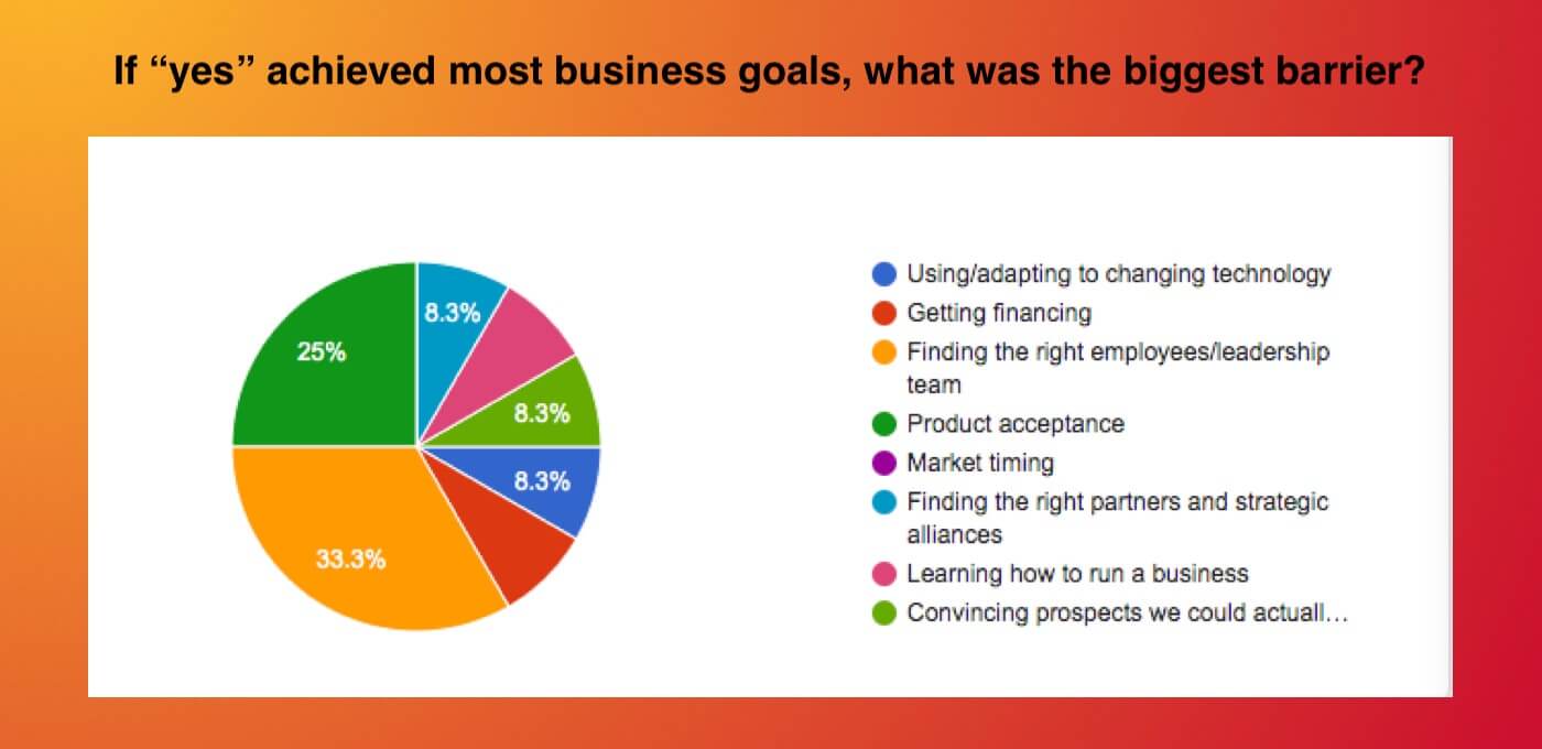 In the responses of business owners who said they had achieved most of their goals, there was a clear majority response to the question, “What was the most difficult part?” Out of five possible multiple-choice answers (plus the ability to add an “other” response), more than 33% of respondents selected “Finding the right employees/leadership team.”